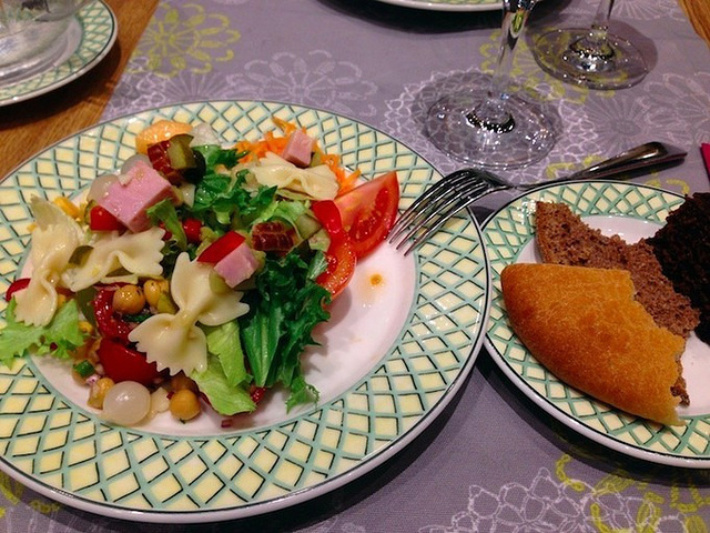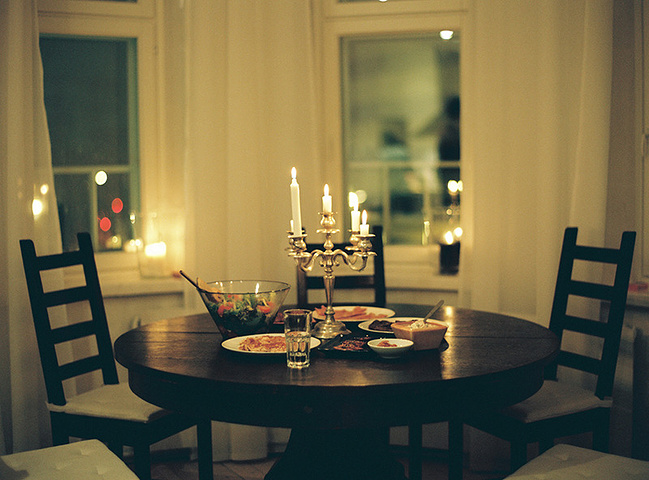 点上蜡烛,摆上沙拉、腊肠、烟熏肉片,我们的烛光晚餐就开始了。