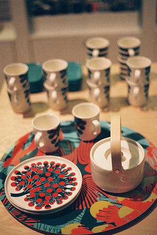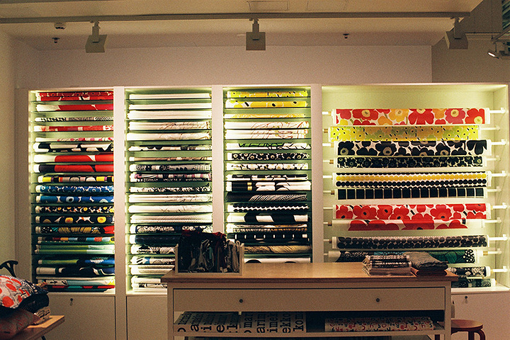 从超市里边吃边买了一顿之后,我们拎着大包小袋走回到今晚的住宿地去。不过中途遇见的这个Marimekko店却让我们又忍不住地沉迷在经典的罂粟花图案和精致小巧的杯盘当中。