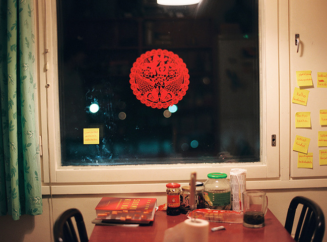 匆匆赶到友人家里,等待着这座城市的明天,等待着那个有我们参与的24小时。贴在玻璃墙上的福字剪纸和桌子上的老干妈揭示着主人的国籍。