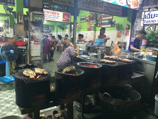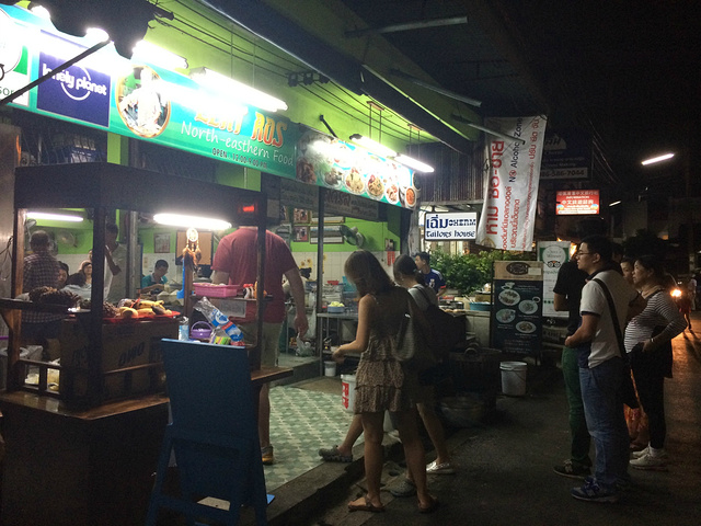 因为晚饭没吃,此时早已前胸贴后背,放下行李第一件事就是去吃饭!!!本来也没想走太远的地方,刚好出了旅馆没走多远,就看到一个类似大排档的地方,人虽不算爆满,但也挺多。看过菜单,本来想点他们店的特色菜,塞的满嘴大葱的烤鱼和烤大虾,但都卖完了,就点了椰奶鸡汤、烤牛肉、炒素菜、芒果糯米饭,每一样菜!!!都让我俩满足到爆!!!尤其是椰奶鸡汤,简直无法自拔,好喝到不要不要的,烤牛肉也贼好吃,略硬,但是味道已经胜过了一切!如果不是住在附近,我想我们绝对找不到,因为真的挺隐蔽,在一条小巷子里。各位如果想去吃,可以找BaanJaJaL旅馆,饭店旁边有个清迈小雨旅游服务处。