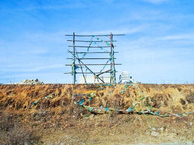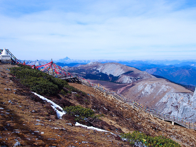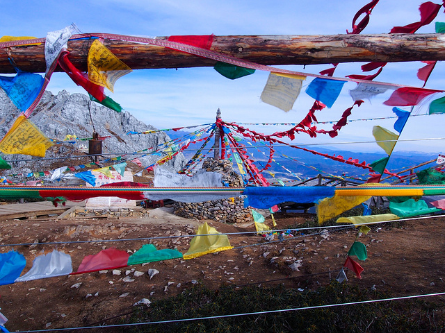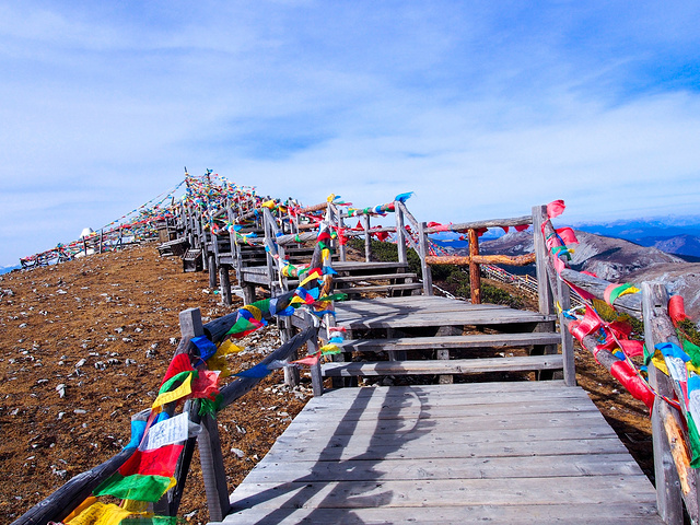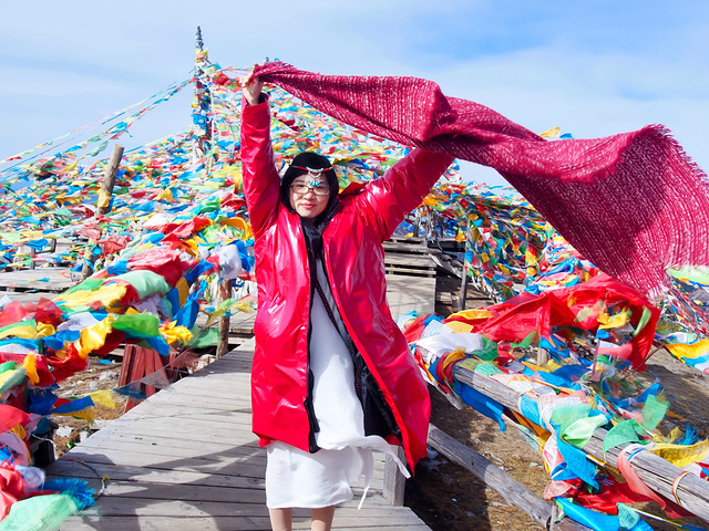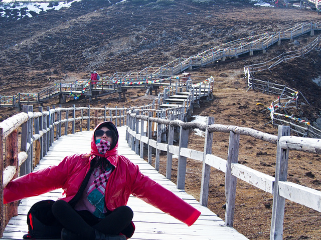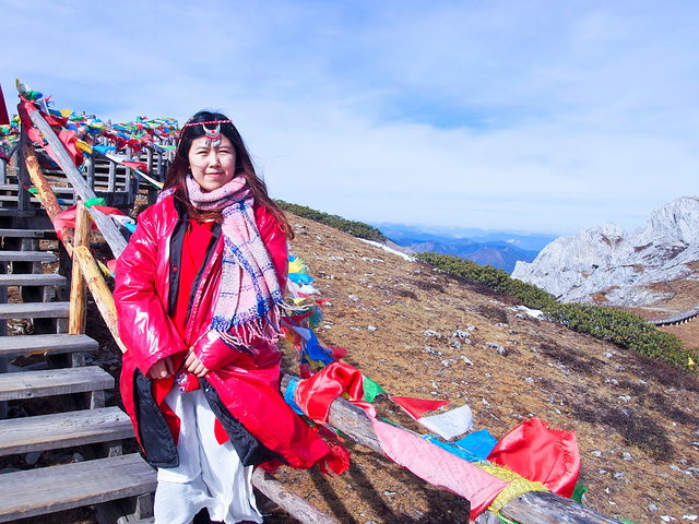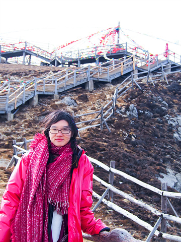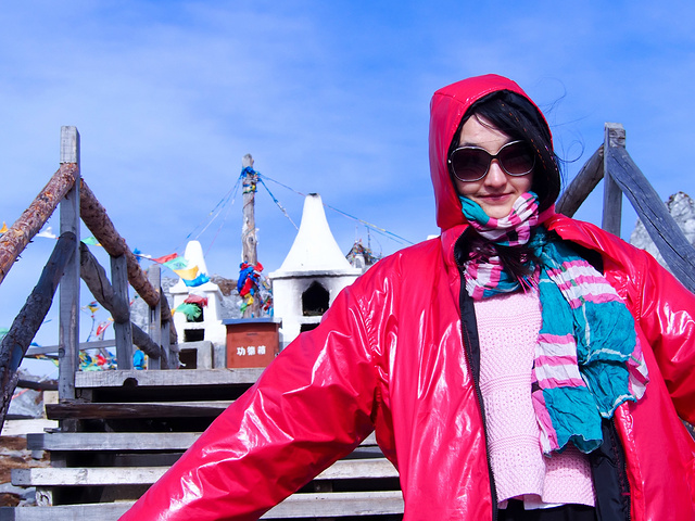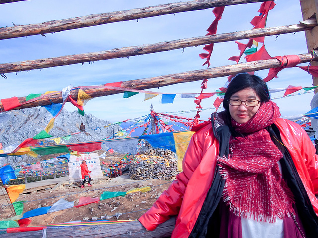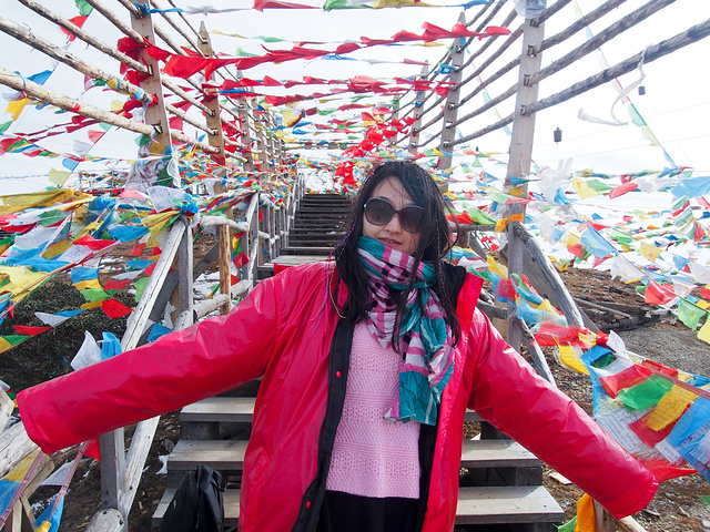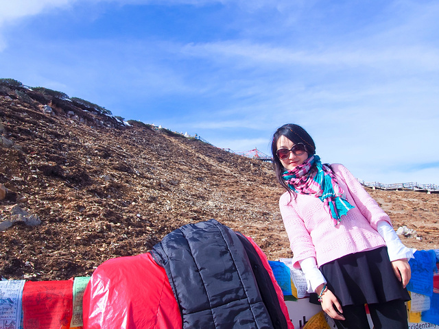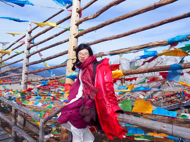 登顶雪山,上面彩旗飘飘,真正有了到了藏区的感觉,山上温度倒也不算低,风却很大,头发飞舞,大家裹得不是像北极熊就是像企鹅,在姐姐的强烈劝导下,我终于穿上厚厚的防风服了,不再要风度不要温度。