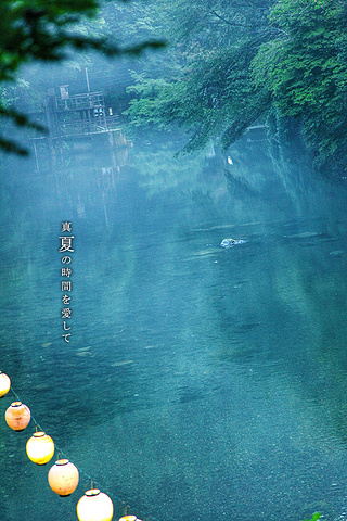 河床上腾起烟雾,暮色将至,灯笼发出的光倒映在河面,美哉。