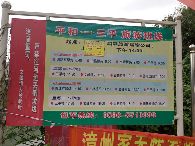 上车跟司机说明到三平寺,司机会在指定地方放你下车(文峰镇),下车后在桥头会看到一个公交站牌样,打上面的电话,跟司机说明你所在的地方,司机会跟你说还要多久能到(一定要打电话,我就因为没有打电话在那傻傻等了一个多小时都没有发现哪辆室直达三平寺的专线大巴)。桥头那边还有摩的可以坐到三平寺(价格30元左右),个人建议坐大巴啦,那个路太陡了,摩托车师傅又开得很快,还容易碰到脾气不好的摩的师傅。