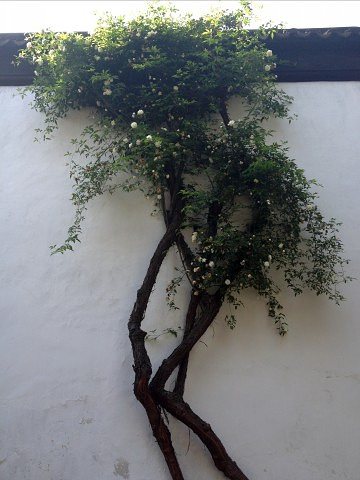 墙体倒是成了白宣,墙根下盆中长起来的虬枝与绿叶白花就是纸上的细致工笔,连不经意的拐角都是精致。