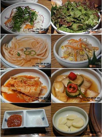 从沙拉到各种小菜和可以包着吃的蔬菜,盐巴,包饭酱,大蒜