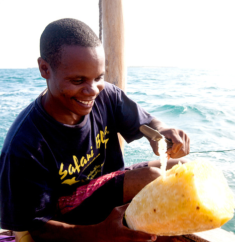 我们是一家叫作Safari Blue的公司给我们安排了一天的浮潜,在两次浮潜至海中时,我看到了许许多多的姿态各异的珊瑚群,一些热带的小鱼,在海里游动,让我激动不已。中午时分,我们上到了一个小岛,在这里吃了一顿海鲜烧烤,除了大量的海鲜烤食,在餐后,还有一堆的热带水果供我们享用,我粗略数了数,起码十几种水果。据说这趟的费用在100美元样子,但大家都有物超所值的感受。