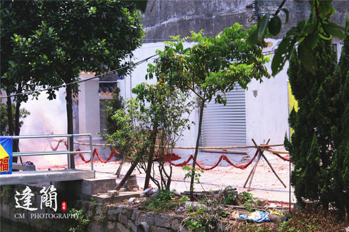 当天8月2号正好是刘氏大宗祠的庆典仪式,村民,游客围在祠堂和河岸看热闹,鞭炮延绵上百米,震耳欲聋的鞭炮声响彻逢简村,热闹非凡