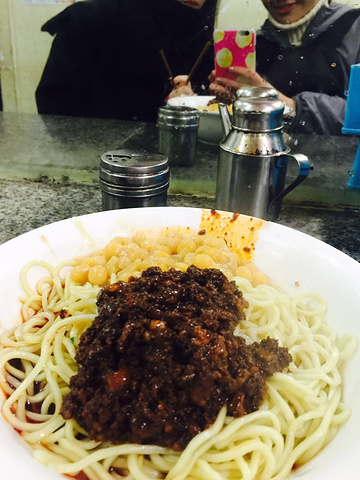 豌杂面 料很足我们叫了二两面¥12 很实惠啊 肉酱豌豆跟面拌在一起 真的很好吃。 人多的时候都是这样一个高凳一个矮凳在门口坐着吃,哈哈好吃 都值得了。