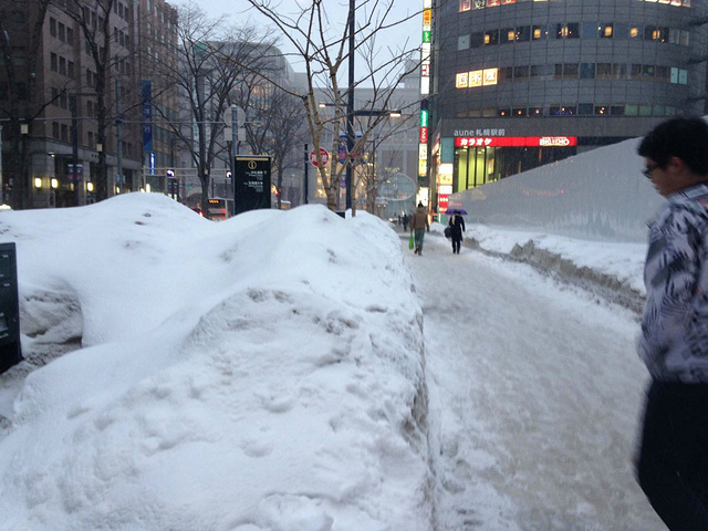 北海道街上的雪对的好高,时不时有摔倒的路人. 当然女子高中生还是健壮的穿着短裙............