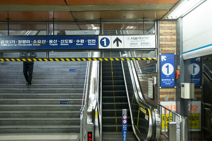 从仁川到首尔乘火车很方便。因为后面要从首尔坐火车去釜山,怕赶上韩国春运买不到票,于是当天晚上就赶到首尔火车站去购买前往釜山的火车票。首尔的地铁比较破,设计也不合理,转车往往要走很远的路。在首尔火车站,地铁在地下7层,坐扶梯上去都累死。看来首尔人民随时准备核大战啊!