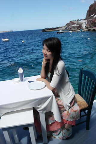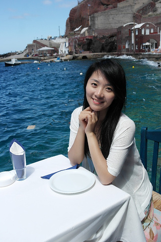 婚纱照一拍完,感觉整个人都轻松啦,主要是肚子轻松啦!前几天怕婚纱穿不进去不敢放开量吃,今天终于可以放开量大吃一顿啦!!在酒店拍照完,小伙伴们便驱车驶向了伊亚的最北端,位于悬崖脚下的小海岸。与其说是海岸,不如说是在悬崖边生生堆砌出的海边平台,很窄很挤,横排只能容纳三到四张桌子,但这里有独一无二的海边烧烤,还有独一无二的美丽景致。我们来到了酒店老板娘强烈推荐的她最爱的海鲜烧烤SUNSET,精致的桌椅就放在岸边,你一个不小心就会“翻入海里”!!