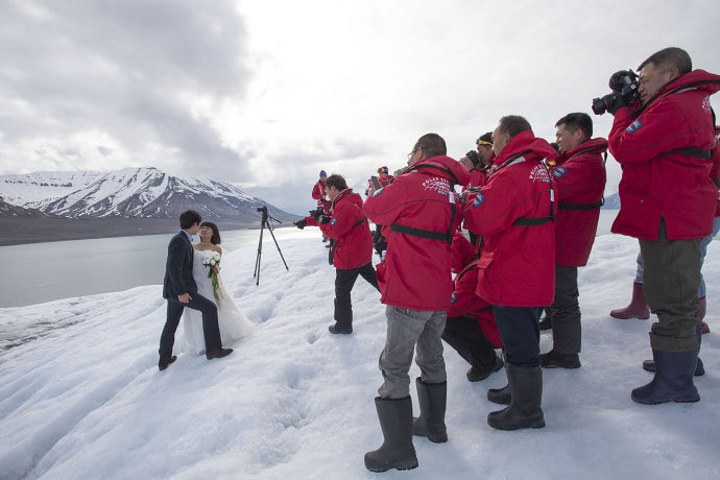 冰川上的婚纱照,可见北极(准确说是斯瓦尔巴群岛)的六月不算太冷。