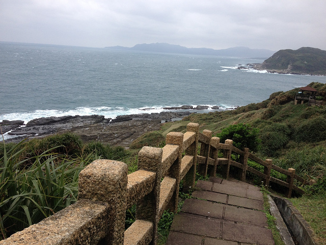 这里的海并不那么的亲切可人。相比于后来在高雄看到的海,如果把后者比作是希腊神话里的爱神阿佛洛狄忒,那么前者则是北欧神话里的雷神托尔。海滨的路并不是沙滩,而是一个通往陡峭小山头的小路,一边有围栏,另一边则没有。那天的风非常大,走路时非常小心,生怕一不小心,就坠入茫茫大海。站在路上的亭子中观海,发现是另一种感受,由于这里是东海和太平洋的分界点,常年风浪都很大,那天尤其甚。传说中的疯狗浪在海中肆虐咆哮。阴沉的天空,呼啸的狂风,滔天的海浪,尽是北国的苍茫,而缺乏南方的脉脉温情。