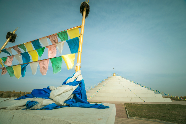 敖包的四角立着4根3米高的三刃钢叉,用马鬃和绸缎做成的缨穗随风飘舞,用各种色彩绸缎制作的禄马风旗迎风招展。