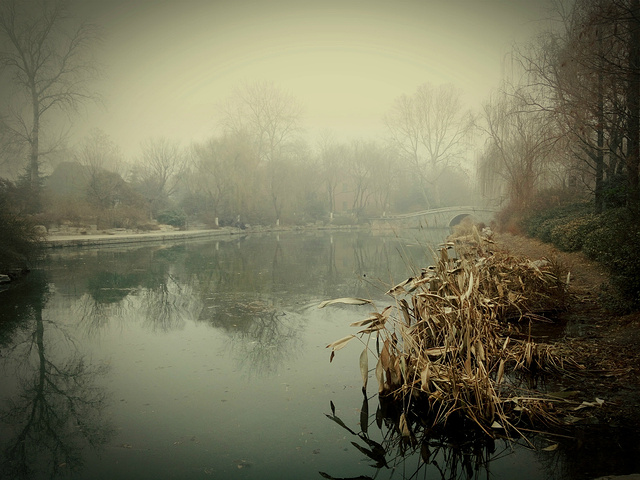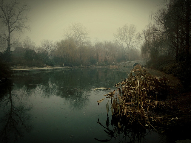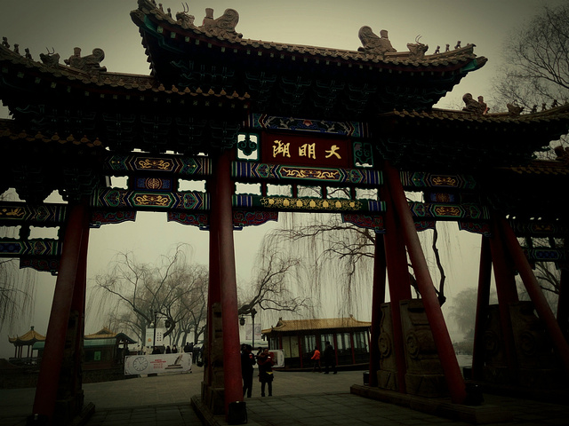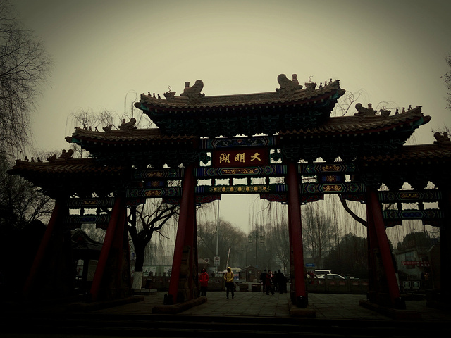 沿着小街一直走到头,你就来到了大明湖的南门,一说起大明湖大家想到的就是“皇上,还记得大明湖畔的夏雨荷吗”?可我脑补的却是容嬷嬷那一张脸,顿时本就寒冷的冬天感觉气温又一次低了几度。大明湖还是推荐大家春夏季节去,我去的时候湖中光秃秃的没有满湖的荷花就剩下几篇残叶,枯黄的耷拉在浅水滩中,济南冬天的雾霾也让你望去都是白茫茫的一片,到时跟仙境有的一拼,所以出门一定要带口罩啊。