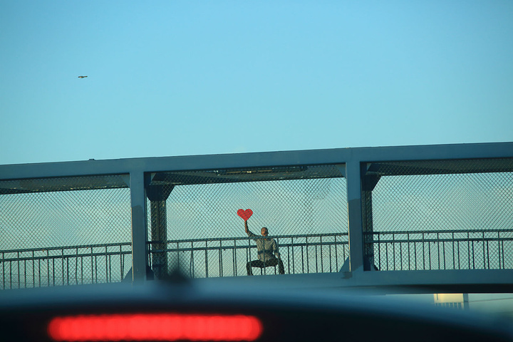 天桥上的行为艺术家,我猜想这是为拥堵在路上的人们舒缓心情的武者。