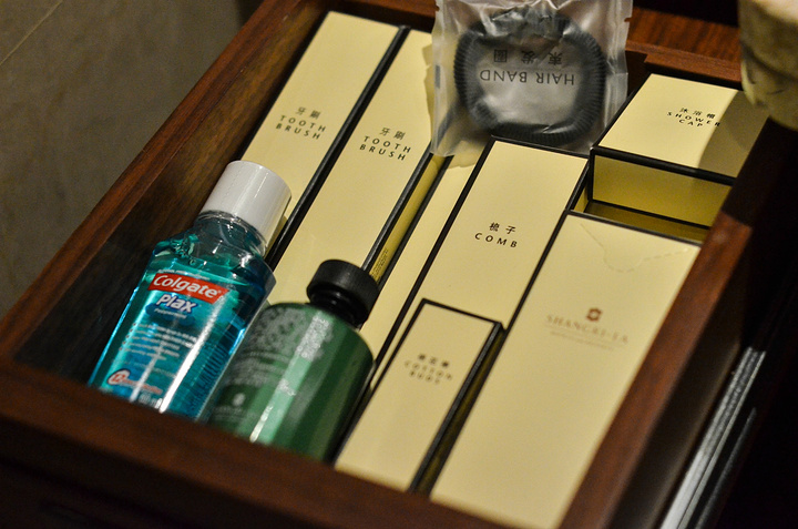 盥洗池台子的抽屉里面的洗漱用品和漱口水。