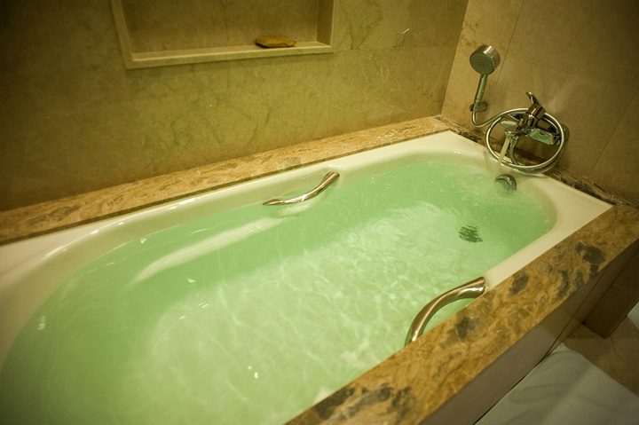 卫生间一角看浴缸和盥洗池,感觉卫生间还是挺大气的哦。