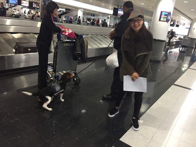 到了纽约机场有个小插曲:警犬闻可以行李,闻到团里一位阿姨的行李时似乎发现了什么,原地坐下不动了。警察略紧张的对阿姨说道:Open it。阿姨也惊慌失措听不懂干着急。我说阿姨别怕,你就让他检查一下。阿姨边嘟囔着边开包,一件一件拿出包内物品,直到一个小瓶子,警犬一下子站起来凑上去…阿姨喊着:我的豆腐乳!