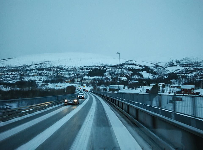 两团的团员抵达挪威当天,都遇到了下大雪。Tromso是我们看极光之地,从机场去留宿地有三十多公里,沿途都是被雪覆盖的房屋和山丘。