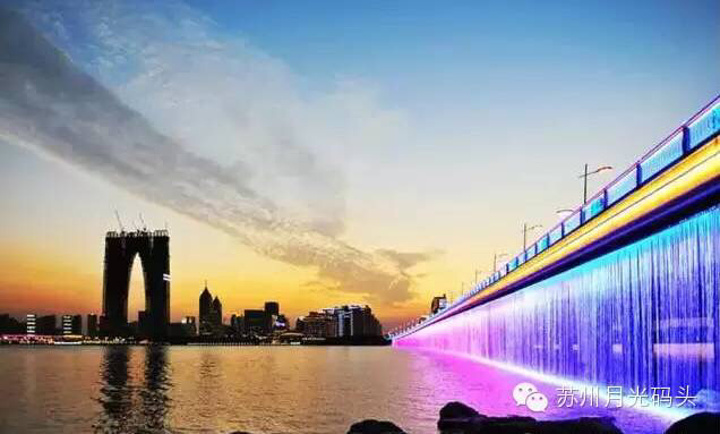 全长2.15公里的金鸡湖大桥,飞虹跨东西,数码灯光瀑布从桥上分流而下,成为金鸡湖夜晚一道靓丽风景;整个大桥桥面宽57.2米。 为方便人们观赏金鸡湖夜景,大桥南半幅的慢车道设计得要比平常要宽很多,达到8米左右。驾车从金鸡湖大桥上横跨而过时,金鸡湖的全景图就像高清胶片一样慢慢播放在眼前。