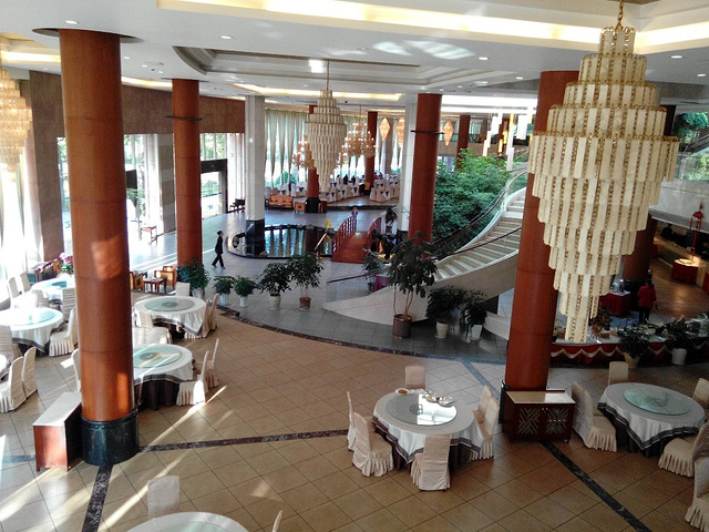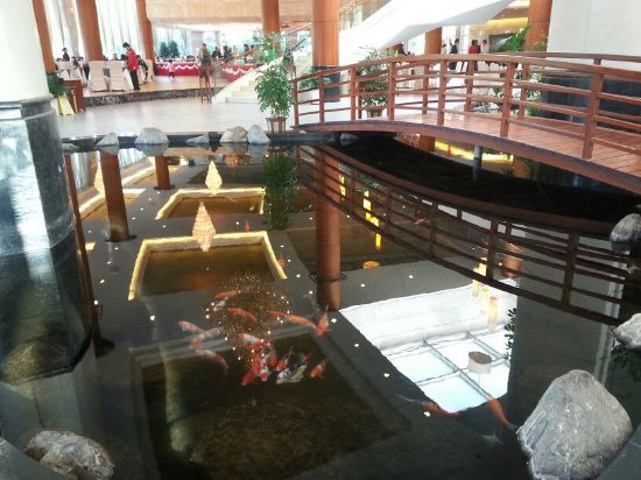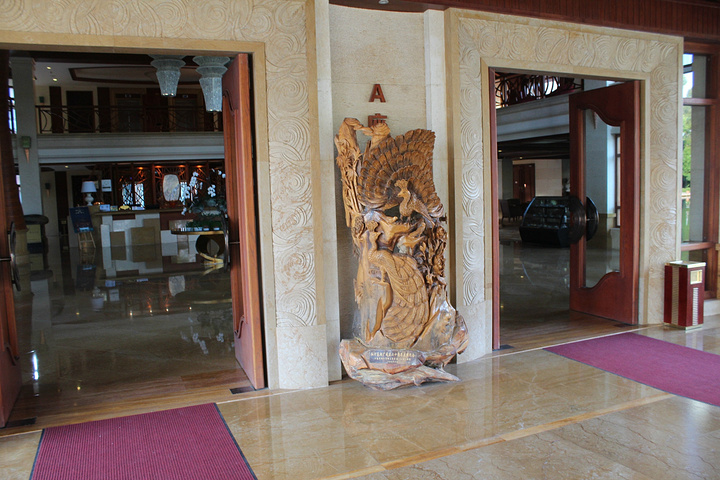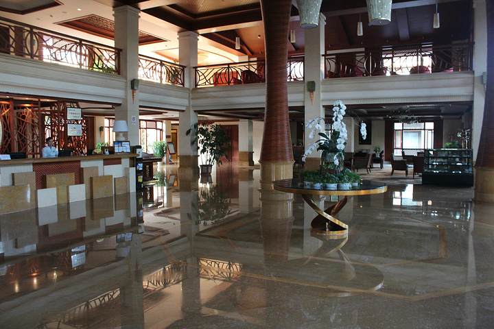 店大堂很气派,一进门就是几个高柱子,工作人员还算热情,报了预定以后办理了入住,并且很详细的讲解了酒店的楼层、温泉和早餐的位置。拿到房卡到房间,通过走廊,特别漂亮,房间楼下有一个超大的水池吧,房间也漂亮,站在阳台上可以看到山和水,总的来说酒店性价比很高,星级标准的客房还包含有温泉,周边的环境也很舒适,风景怡人。开车出去5分钟就有商业街,有当地小吃,粉店和餐馆都有。很方便。