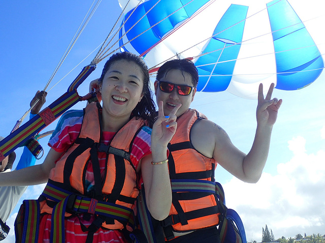 感谢我们的导游给每一对都记录下珍贵的一刻,好人啊!突然起飞的时候有点点小紧张,等飞上去了就觉得天地辽阔,比一个人的感觉更踏实更安全,因为老公在身后哈。上次在泰国的空中飞人我没有要求点水动作,这次的点水真的让我半个人都跌到了海里面,吃了好大一口咸咸的海水!