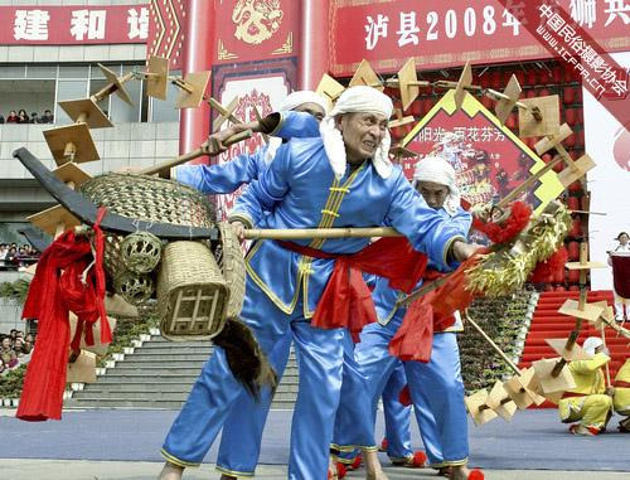泸县龙舞艺术起源于唐宋时期,鼎盛于明末清初,是地处龙洞山的雨坛人设坛耍龙以求风调雨顺、五谷丰登的圣物。彩龙龙体造型别具特色,龙头彩绘精美,龙身长30米,共13节,龙体浑圆灵活,威武雄壮。雨坛彩龙的表演突出在一个“活”字,表演时,舞龙者“形于外而动于中”,人与龙的情感交融一体。表演造型精彩,套路丰富,观赏者不仅从中领略到巨龙夺宝的恢宏气象,而且可以感受到中国龙鲜活灵动的生命情态及不屈不挠的民族精神。2006年,雨坛彩龙在人民大会堂演出,胡锦涛总书记亲自为雨坛彩龙点晴。
