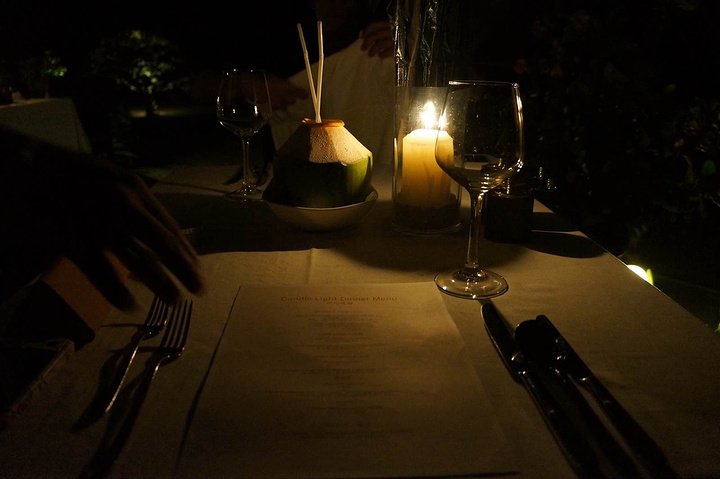 晚上的烛光晚宴在此开启,这个餐厅靠着健身房!菜单和椰子,谁告诉我椰子好吃的?不好吃~还凑合~还不错,肉食动物伤不起,就觉得肉好吃!西餐不能多吃,开始怀念土豆炖豆角是什么节奏?来自游记马尔代夫莉莉岛蜜月之行