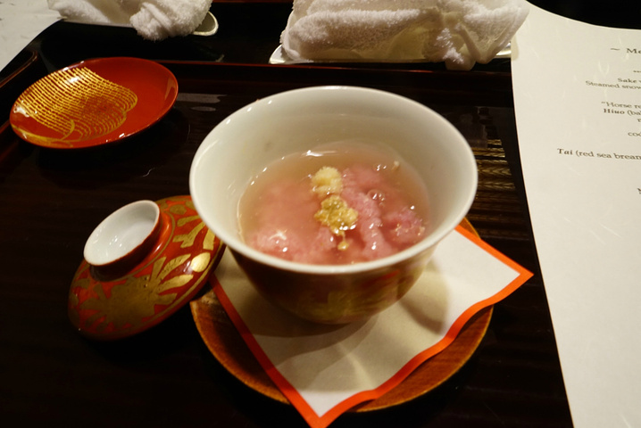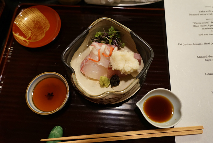 第一道,端来一个小碟子(上图左上角),倒上一点透明像水的物质,一看菜单才知道是梅花酒(看日文菜单也能看懂<( ̄ˇ ̄)/)。真贴心啊,给我们暖暖身子~~