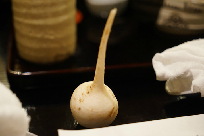 不知道鲷鱼刺身旁边的配料是啥来的,问服务员,服务员居然拿实物给我们看( ⊙ o ⊙ )啊!他的热情让我们震惊了一会儿~这实物忒可爱了,这么小的白萝卜~~好像是初生的婴儿就被你们摘了。。。
