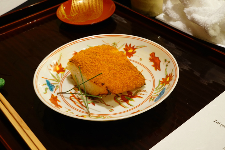 第六道,烤鲽鱼。鲽鱼就是比目鱼,由于是深海鱼类,取得不易,只有在日本的高级料理亭中才能吃得到, 菊乃井不仅献上了厚切鰈魚,还搭配乌鱼子,味道出奇地融合,成为这次餐点的另一個高峰。
