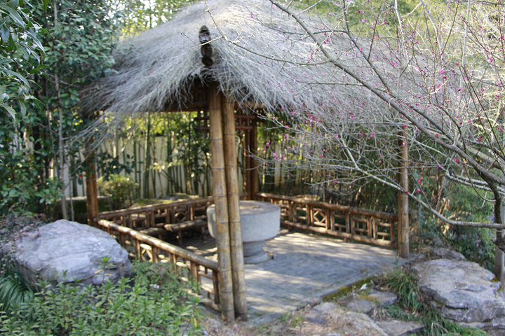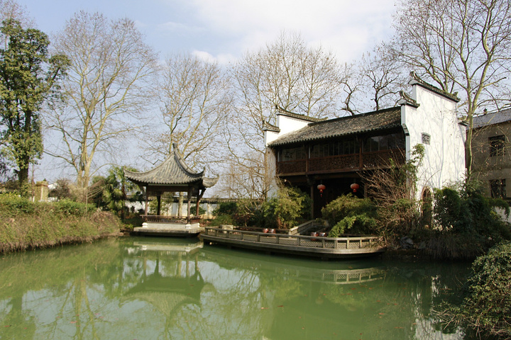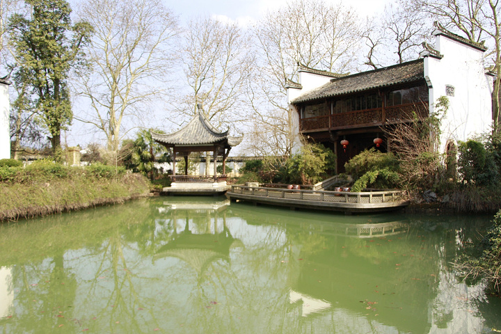 桥右侧还有半边池子。是个凉亭与带露台的厅堂。春意将至,万物虽未复苏却一片盎然惬意。