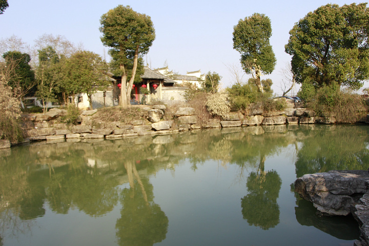 从门口的池子对岸小坡上看众园。