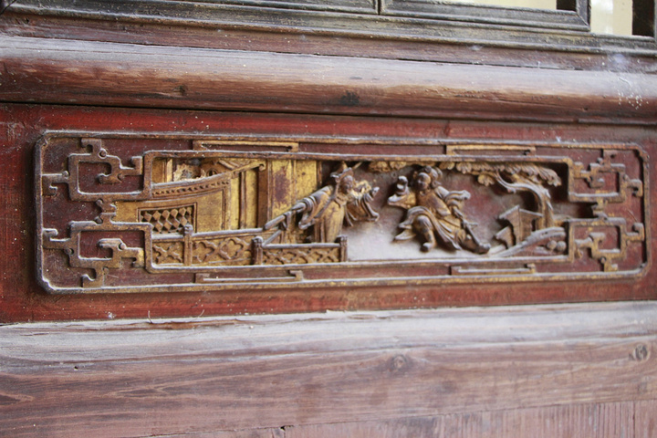 依然精致万分。似乎是龙头,鱼身。这各地的屋角和室内的转角装饰,所刻之物也是有讲究的。如当地文化中膜拜的神兽,威严的,送福的,辟邪的,招财的,包括很多《山海经》里的上古神兽,各种头身尾组合型的神兽等。比如我在内蒙古的寺庙类的建筑上看到的神兽,就一个都不认识…………