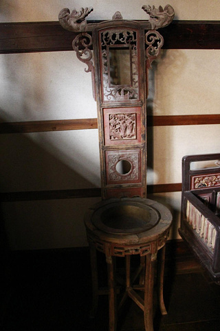 长椅。左边这半个圆是古人的小洗脸盆啊。上面是挂毛巾洁具的架子,也会有镜子。细细看雕纹,美不胜收。