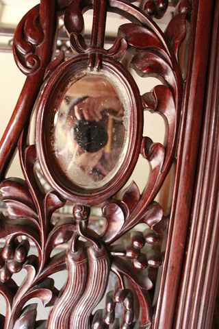 需要辟邪的主人,会在木床的挂落上镶嵌一面镜子朝外,当然这样的镜子用于反映景物的作用很小,主要就是当"风水镜"来用的。