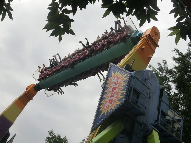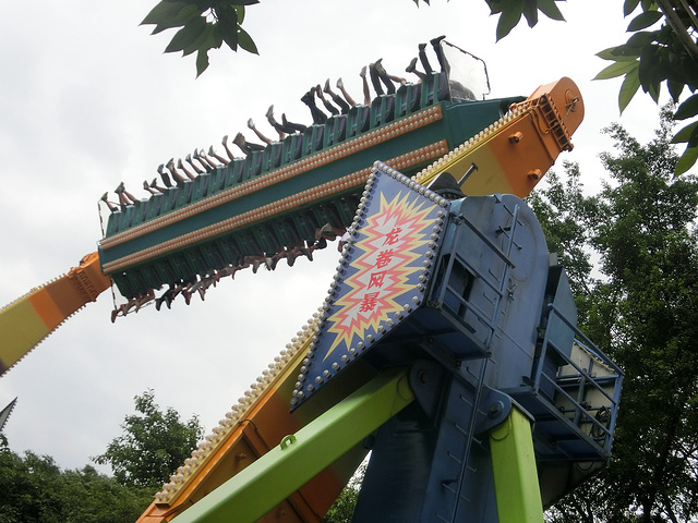 虽然大摆锤也是来回有180度的摆动,离地面也有90度垂直还不停旋转但是它速度很慢,刚开始第一次到制高点的时候有点紧张后来我就完全放松了,微风徐徐好舒服哈
