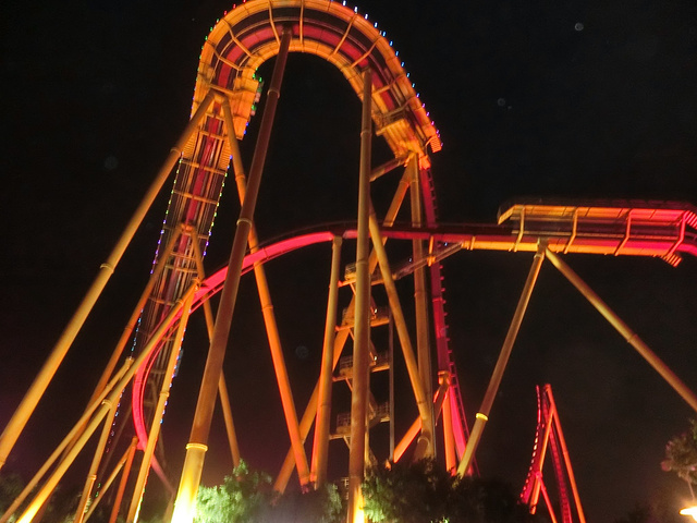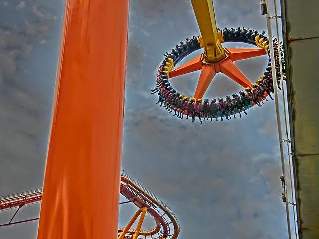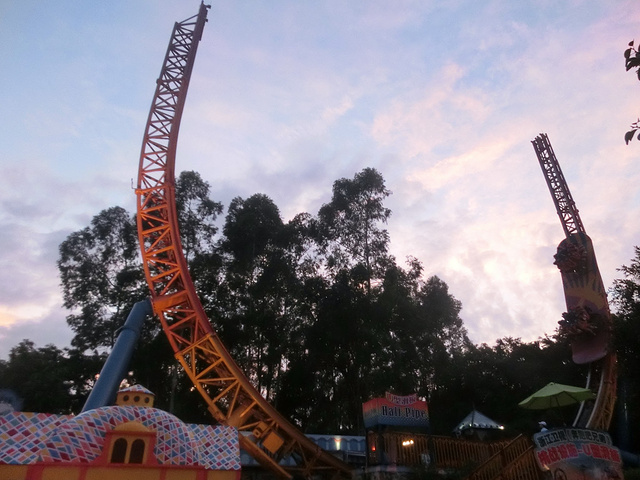 我要说的是这些都是错觉,事情一点都不高虽然滑板两边是完全垂直的还不停旋转但是你只要坐过了垂直过山车这些真的都不在话下,根本没得比好么