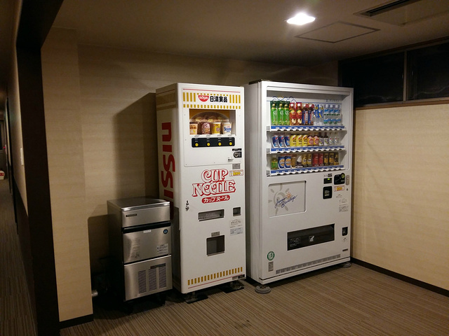 每层楼都有贩卖机。那个小的是冰柜,里面的冰粒自取。
