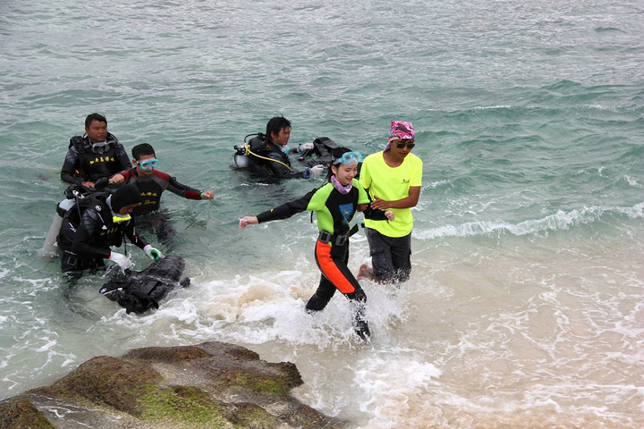 我们是在某宝上订的加井岛一日游,深潜+浮潜+香蕉船+吃饭+来回车票=500左右,集合出发时间是早上6点半,6点半就得出门哈哈哈,好早好早好早。其实没有潜水前本人还是有点小紧张的。克服自己潜下去的时候,很开心,海底很漂亮,也喂了鱼哈哈哈。