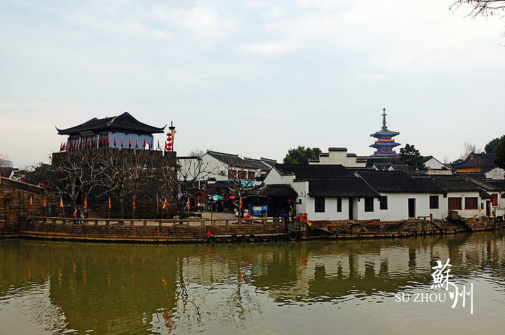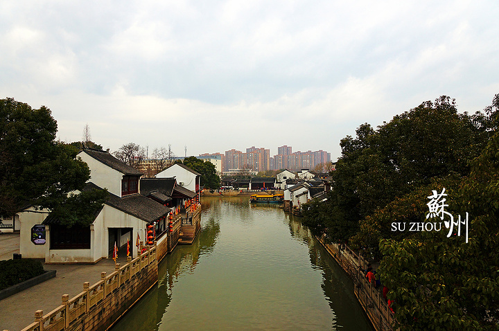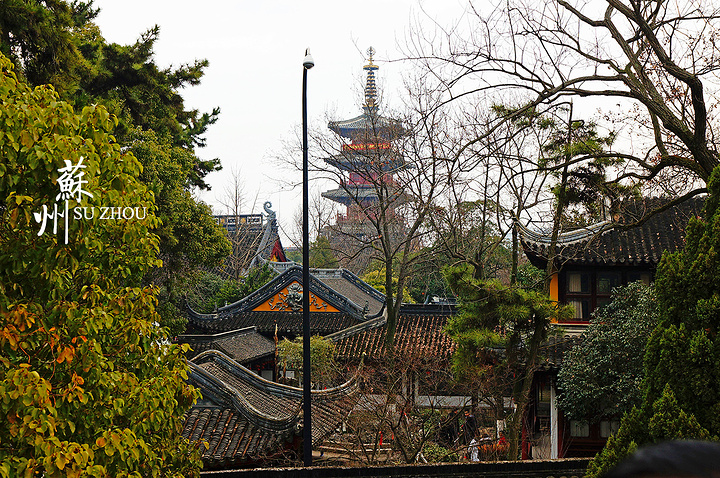 站在江村桥上向东回望寒山寺。暮雨疏烟、亭台楼阁,应该是个挺不错的景色,不过树有点多,遮挡太大。