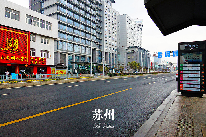 在东环路乘轨道交通1号线,到桐泾北路站下车,往西走几十米就是公交站,叫“开放大学”,我不明白这是为什么。在这里乘9002路社区环线,到寒山寺站下车就到目的地了。等车时随手拍了几张。