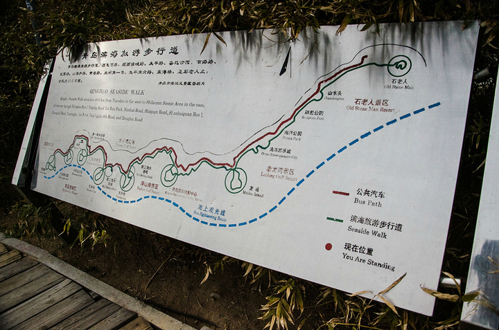 在木栈道的位置,有这样的指引图,可以根据上面的路线选择游览八大关海滨,非常的惬意。