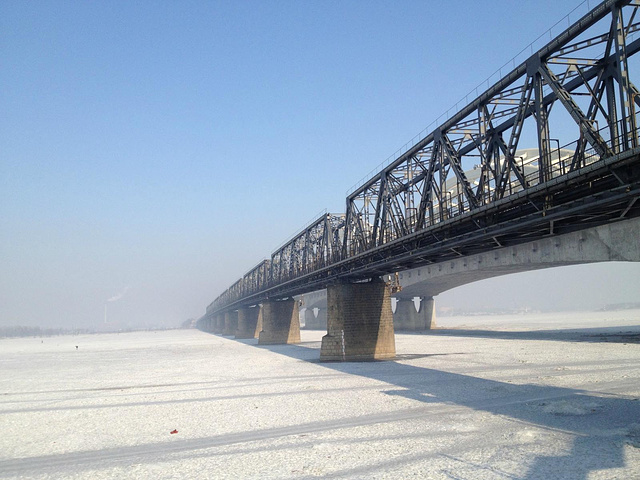 这是中东滨州铁路,拥有百年历史,横跨松花江,江面在零下十几二十多度的气温下已经被结实的冻住了,我被如此景色所震撼!
