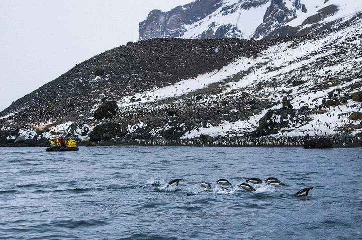 海有天敌——豹海豹。企鹅们就在等待谁先第一个跳下去。当有企鹅跳去时,其他企鹅也迅速地跳下去,选对时间至关重要。这时候天空飘起冰加雪,落在身上变成水珠滚下来。这也是为什么一定要把防水裤套在长靴外面的原因!落在身边的雪以及溅上来海水,不会顺着裤子流进鞋里。这个经验思源客在骑车进藏的活动中就深有体会!