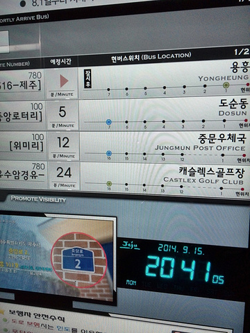 济州公交站的显示屏做的很好,乘客可以很清楚的知道等待下一班车的时间。国内如果也这么推广,会大大提高乘客的效率和心情,但我想难得应该不是电子技术,而是如何做到准时。来自游记Jeju,你再多留我一会儿,我一定留