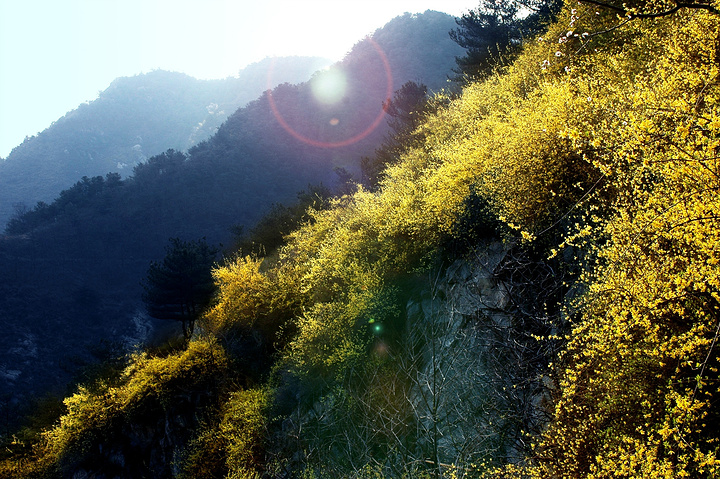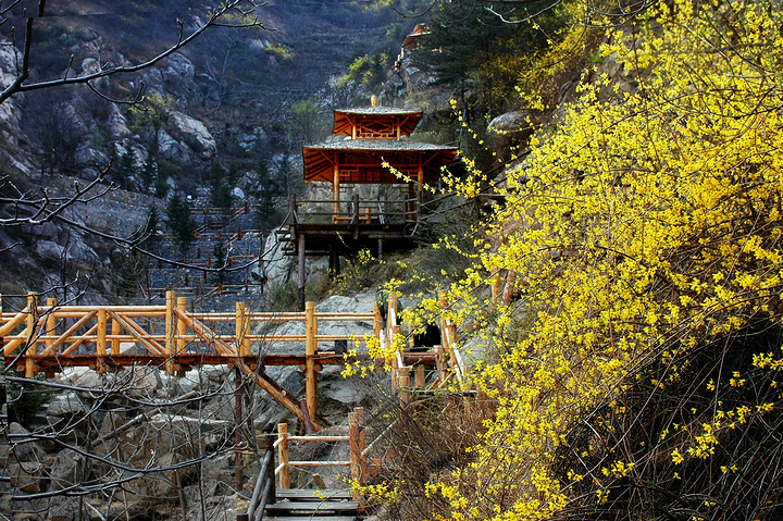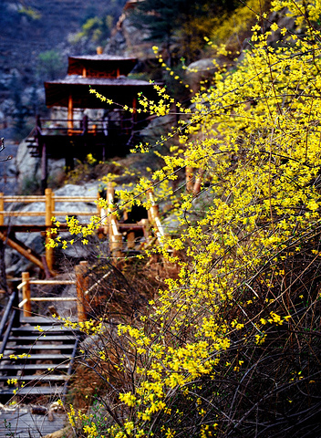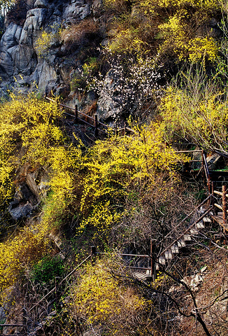 九如山山高地远,相比市区春天来的较晚,却味道更浓,色彩更鲜艳。泉瀑叮咚轰鸣中,漫步于山腰曲折萦回的原木栈道,欣赏着漫山遍野肆意开放的山花,别有一番风味。