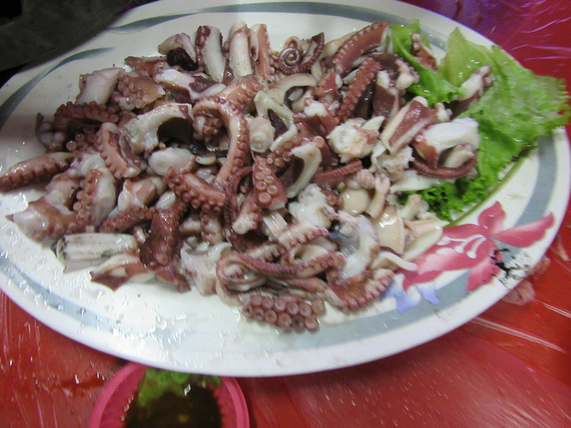 海港此时已经夜幕降临,港口里停泊的海船已经整齐如一安静下来,一条缀满灯光的铁桥,开始了妩媚的夜色阑珊。停好车,一路赶向港口边的渔民海鲜滩。没想到这点已经要收尾了,不大的市场已经没有渔民了,在港口的岸边,只有几个快要收摊的渔民,常先对这里的海鲜好像也不熟,要了几条鱼,海贼、虾之类的,也就这些了。到内街的餐馆加工了。很地道的海鲜做法,也算美味至极。吃完海鲜,夜开始了,星空暗涌着云彩,街灯在路边孤独亮着。我们结束了一天的奔波,往台北进发。