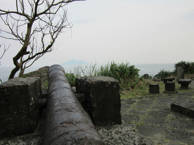 根据路程,赶到苏澳时间比较紧张。延东岸的几个景区没有停留。车子快到北关时,朋友指着左边海里凸起的一座小山:看,那就是龟山岛。顺着左边望去,一座形似乌龟的山体清晰可见。常先说:龟山岛属宜兰县,在海岸以东约10公里处,为孤悬于海中之火山岛屿,因其形似浮龟而得名,富有山峦、海蚀洞、湖泊、特殊崖生植物及丰富的海洋生态资源。原来有福建迁徙过来的渔民住在岛上,人不多。后来由于岛上生活困难和交通不便,陆续迁回本岛,后来由于军事需要政府强行全部迁回村民,并作为军事演练射击基地,就彻底变为无人岛,88年解除戒严,龟山岛才逐步开放,但是上岛需要申请且有严格人数限制,据说附近海域因常出现大批鲸豚,也成为热门观光景点。开到北关的沿岸,距离龟山岛较近的地方,到了一处公园——北关海潮公园,又称兰城公园,一座景观丰富的海滨公园。 在这里做了短暂停留,漫步海潮公园,安静的海滨小道,稀疏的树木,堆积的礁岩,常先一直念叨的小彩蟹在岩石底下也没有找到。公园里立有两尊古炮,锈迹斑斑对着龟山岛,据说是清代嘉庆年间所铸造的古物。沿岸的礁石形态百异,海水拍打礁石,远处的龟山清晰可见。